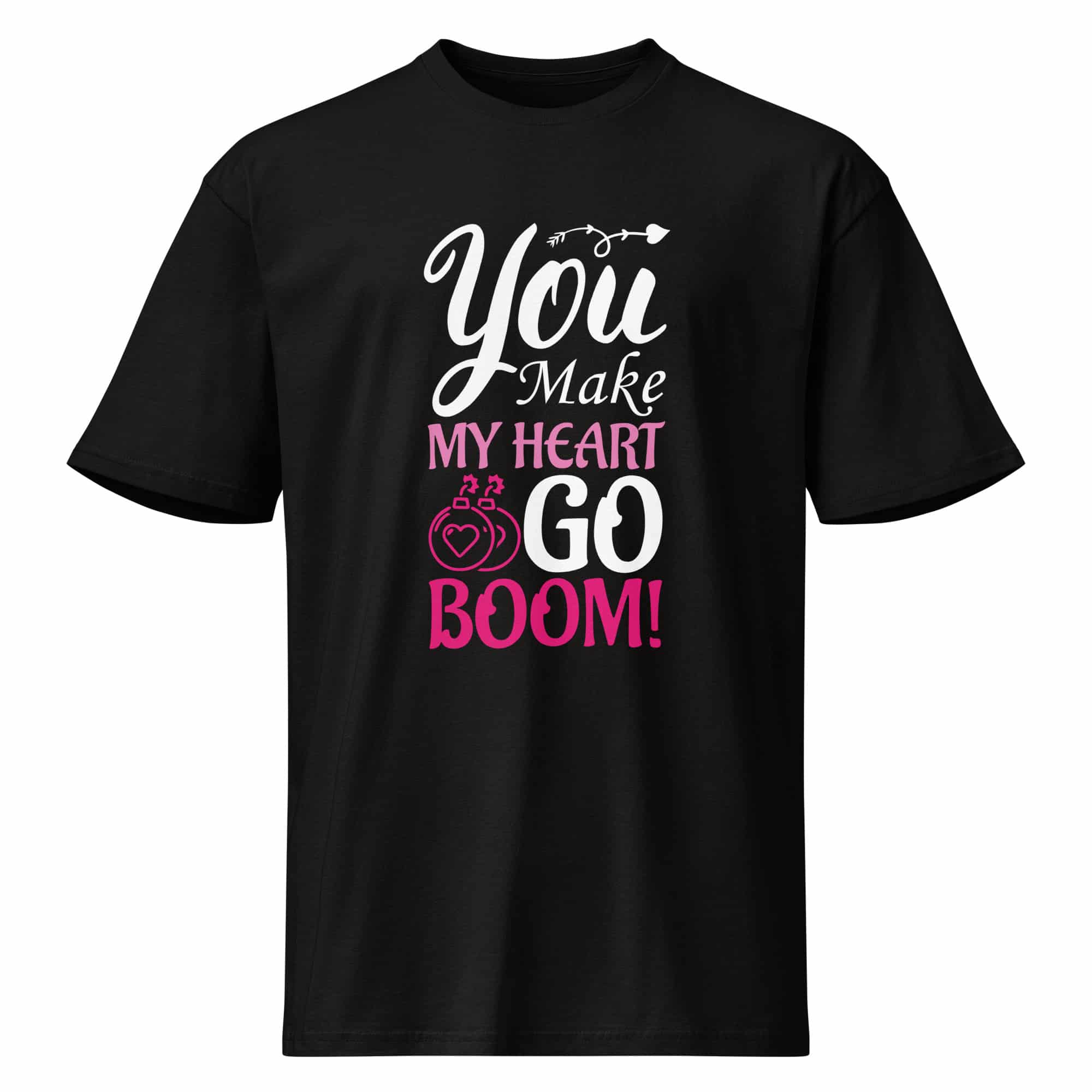 A Design With Explosive Energy This tee captures the thrill of romance with a playful twist. Featuring the dynamic phrase “You Make My Heart Go Boom,” this design brings a pop of excitement to your Valentine’s Day wardrobe. Whether you are into comic book vibes or just want to tell the world that your heart skips a beat for your special someone, this shirt says it with style and enthusiasm.